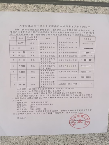 2026年2月14日,正值春节假期,中远白鹿汀洲小区张贴了一份《关于白鹿汀洲小区物业管理委员会成员名单及职务的公示》。公示注明:如有异议,请以书面形式向相关部门反映。